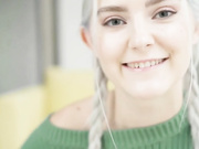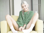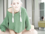 Ash haired teen in sweater rides dick to get a creampie load.