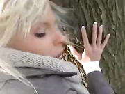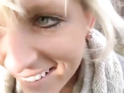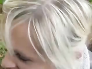 Pretty blonde amateur girlfriend with superb eyes fucking her guy doggy style outdoor and then she swallows all his jizz.