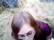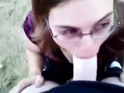 Nerdy chick with glasses is outdoor with her boyfriend. He takes out his cock and she goes down on her knees and starts sucking it.