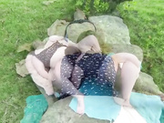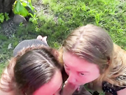Description: Chubby ladies in pussy licking action outdoor when a guy joined them too for some fun.