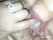 Homemade close up of my wife's hairy wet pussy. I jerk myself and cum on her twat.