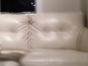 Busty babe with big ass is very horny. She mounts her dildo on the couch and rides it in reverse cowgirl.