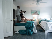 A busty MILF fucks a young stud while a camera guy is busy.