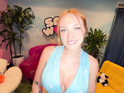 Description: Busty redhead chic sucks deep and facialized.