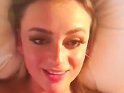 Sexy teen gets covered in cum and start tasting it.