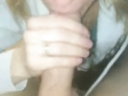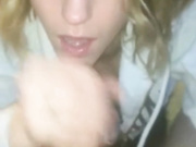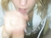 Blonde chick strokes dick and sucks, licking all that sticky jizz.