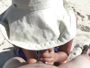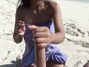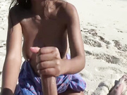 Hot Asian babe with big fake boobs jerks off my long dick on a beach and ends cumshoted
