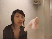 Hot brunette teen with big natural boobs sticks a big dildo on the glass wall and sucks it. She moves to another spot and starts riding it to orgasm.