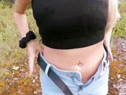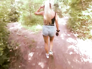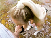 Horny blonde with big round ass and saggy tits with big nipples takes cock outdoors and moans