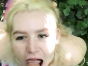 Sexy blonde on her knees deepthroats big white cock and swallows cum outdoors