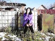 Brunette kinky babe is smoking outdoor, wearing no panties and using her favorite dildo inserted in her pussy.