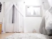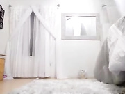 Hot brunette babe with big but fake boobs in her white bedroom expose her naked body to the webcam and toys her ass.