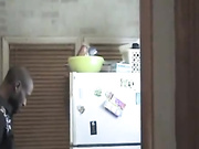 Blonde Milf dressed as french maid is fucked doggy style right in the kitchen by this horny black dude.