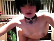 Thin mature brunette MILF gets naked in front of the webcam showing her perky small tits and fingering her mature twat.