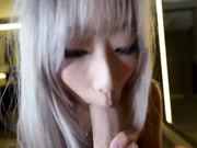 Description: A cute blonde Japanese teen doing her best to drain a white cock.