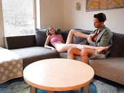 A lustful morning with a naughty couple having hot sex on the couch.